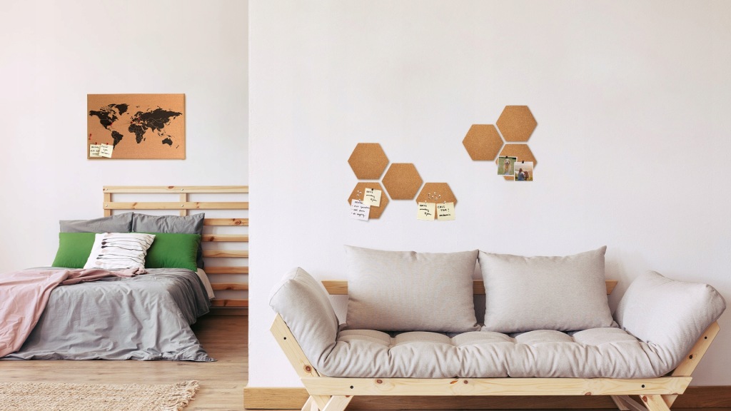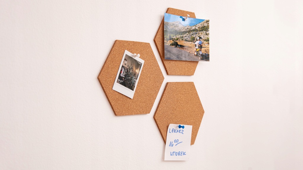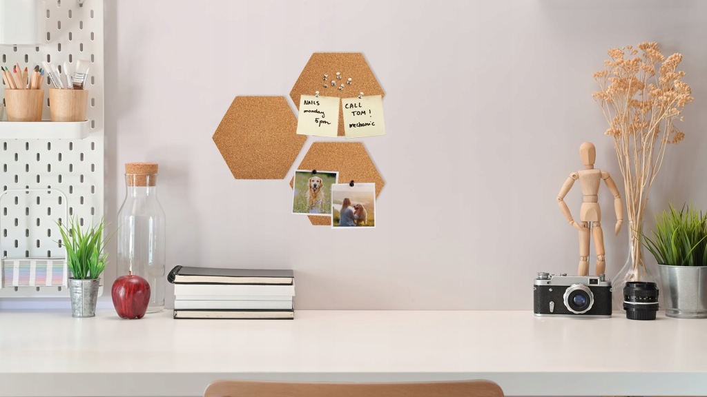 - легка установка - коркові Дошки у формі шестикутника легко приклеюються до стіни за допомогою спеціальної двосторонньої стрічки, яка знаходиться на зовнішній поверхні виробу.