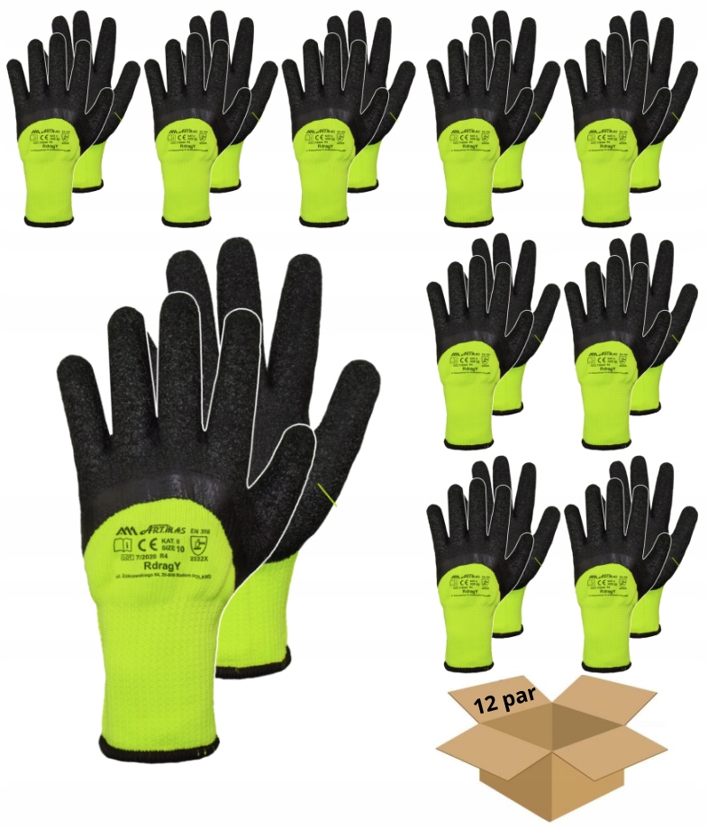 утеплені захисні рукавички-ідеальний вибір для роботи в суворих зимових умовах. Виготовлені з трикотажної махрової тканини, вони забезпечують відмінну теплоізоляцію, а покриття з шорсткого латексу гарантує надійне зчеплення і стійкість до стирання. Завдяки флуоресцентному жовтому кольору рукавички збільшують видимість, що має вирішальне значення в умовах обмеженого освітлення. Безшовна конструкція і знімач забезпечують комфорт і стабільність на запʼясті. Рукавички відповідають стандартам EN 388: 2016 (2.2.2.2) і EN 420:2003+A1:2009 з сертифікатом CE Cat.2. Доступні в розмірах 9, 10, 11, вони гарантують ідеальну посадку.