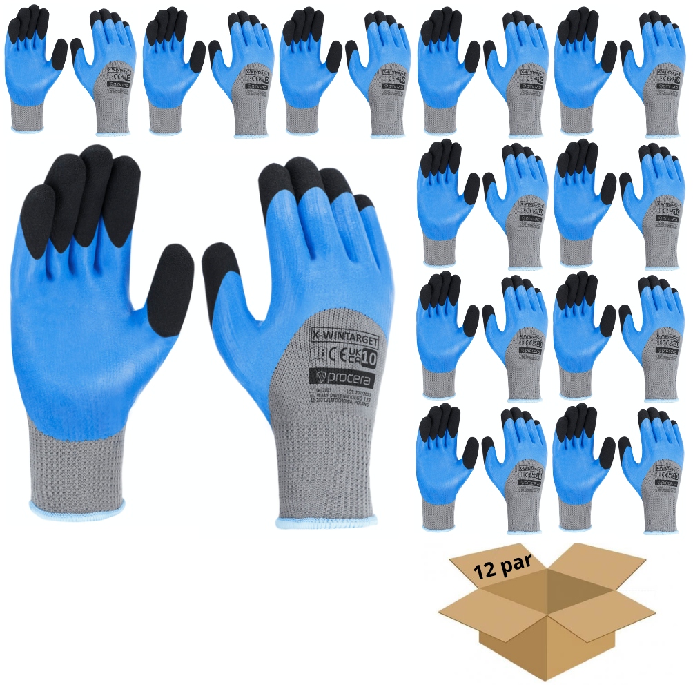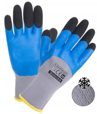 утеплені робочі рукавички X-WINTARGET-ідеальне рішення для зими. Виготовлений з міцного сірого поліефірного трикотажу, покритого синім латексом в області захоплення і 3/4 верху, забезпечує чудове зчеплення і захист від вологи. Крім того, кінчики пальців покриті чорним спіненим латексом, що збільшує їх міцність і зчеплення. Завдяки зігріваючій підкладці рукавички відмінно підходять для низьких температур, а еластичність і гумка на запʼясті забезпечують зручну посадку. Вони сертифіковані CE, що підтверджує їх високу якість. Відмінно підходить для робіт в логістиці, будівництві, механіці та сільському господарстві. В комплекті 12 пар