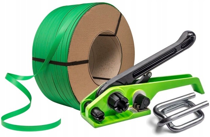 професійна система пакування вантажів вагою до 600,00 кг.міцність стрічки розраховували на 5 стяжок стрічки. Пакувальний набір широко використовується в лісопильних, столярних, будівельних, бетонних, сільськогосподарських, садових і садових підприємствах. Скрізь, де є необхідність повʼязувати матеріали, які вимагають стабілізації під час їх транспортування або зберігання.комплектація: