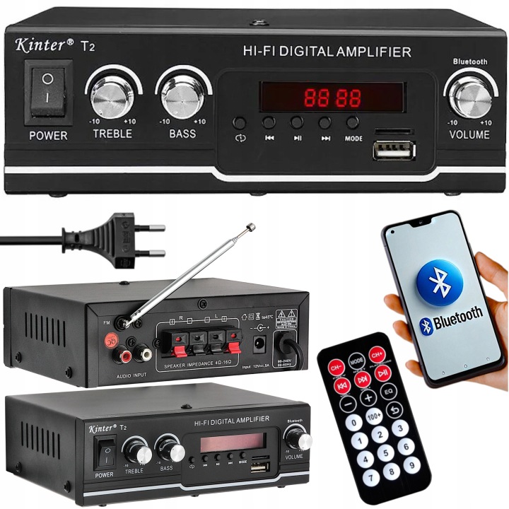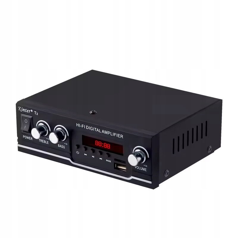 багатофункціональний міні-підсилювач звуку Kinter T2, який ідеально підходить для різних аудіосистем. Завдяки сучасному звуковому чіпу підсилювач забезпечує чудову якість звуку Hi-Fi, а вбудований модуль Bluetooth дозволяє відтворювати музику по бездротовій мережі. Це ідеально підходить для використання вдома, в офісі або в майстерні.