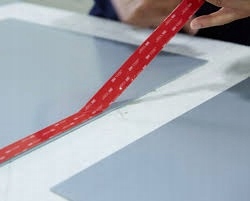 найголовніше при нанесенні будь-якої стрічки, це підготовка правильної поверхні склеюваних поверхонь. якщо стрічка відвалюється, то більше 90% випадків вказують на погано підготовлену поверхню. Для кращої адгезії клеєні поверхні повинні бути знежирені ізопропіловим спиртом, чистими, сухими і вільними від будь-яких забруднень. стрічка повинна застосовуватися при температурі 21-38°C. нижче на малюнках ми крок за кроком представляємо процес правильного нанесення.