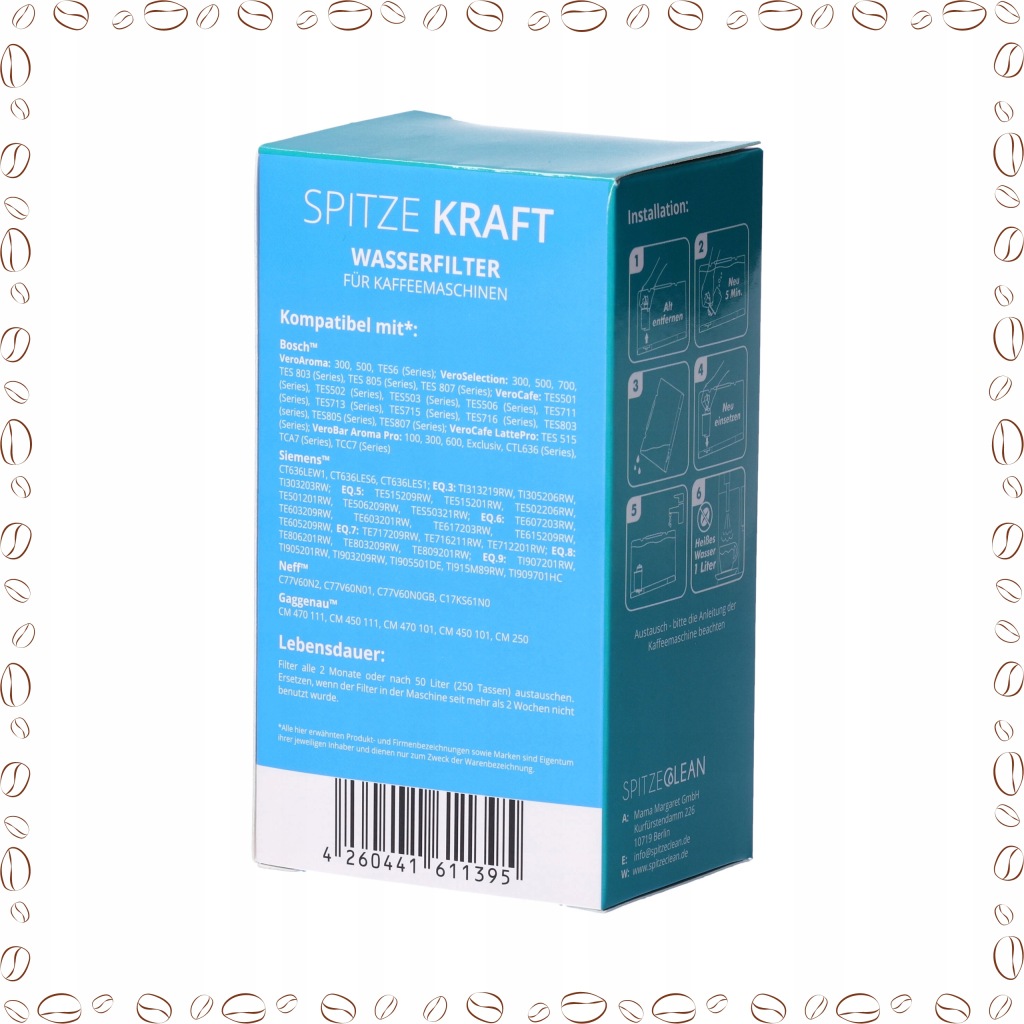️ ️ регулярна заміна фільтрів-це ключ до тривалого і безпроблемного використання машини . Наші фільтри не тільки захищають пристрій від накипу, але і значно покращують якість приготованих напоїв. Завдяки ефективній фільтрації кава набуває більш повний смак і аромат, а чай позбавлений неприємного присмаку хлору. Інвестуючи в набір фільтрів Spitze Kraft, Ви економите не тільки на обслуговуванні кавомашини, але і отримуєте щоденне задоволення від насолоди чудовими напоями.
