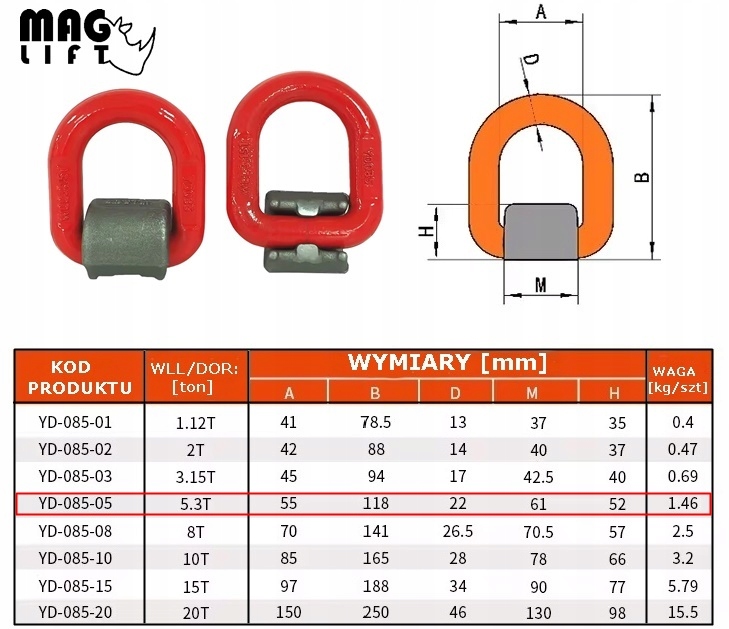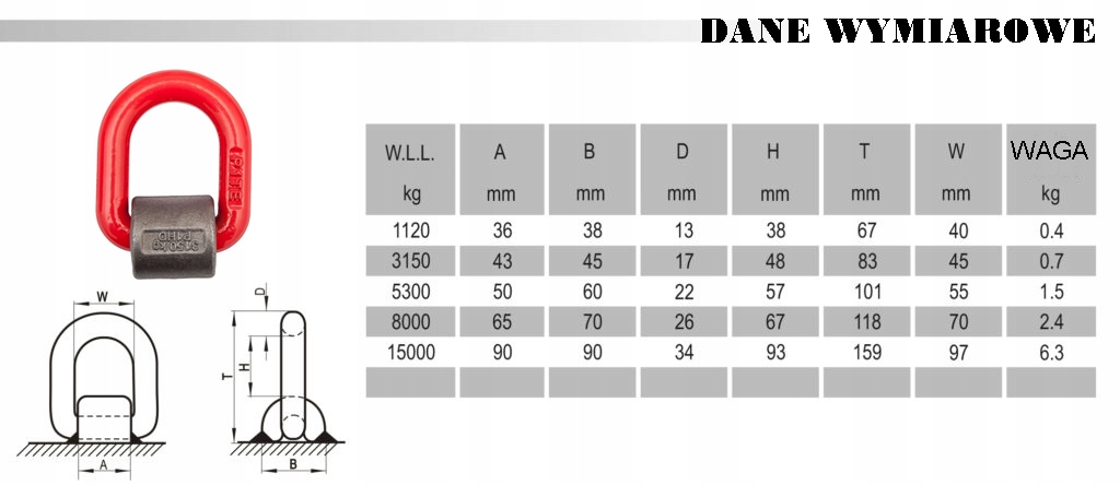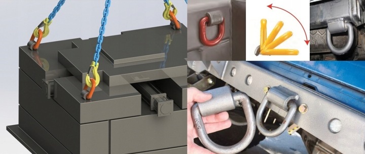 виконання : ручка для зварювання типу D-ring після зварювання дозволяє вільно обертатися на кут 180 градусів навколо осі підстави, зберігаючи при цьому рівномірне навантаження. Підключення тримача до основного елементу методом зварювання. Ручка оснащена пружиною, яка дозволяє тримати вухо в будь-якому положенні, в той же час пружина, розташована між вухом і кріпильним елементом, знижує шум, викликаний вібрацією. Ручка з порошковим покриттям жовтого або червоного кольору /колір залежить від поставки/, виготовлена з штампованої легованої сталі. поставляється у версіях DOR: 1,12 t; 2,0 t; 3,15 t; 5,3 t; 8,0 t; 15,0 t.