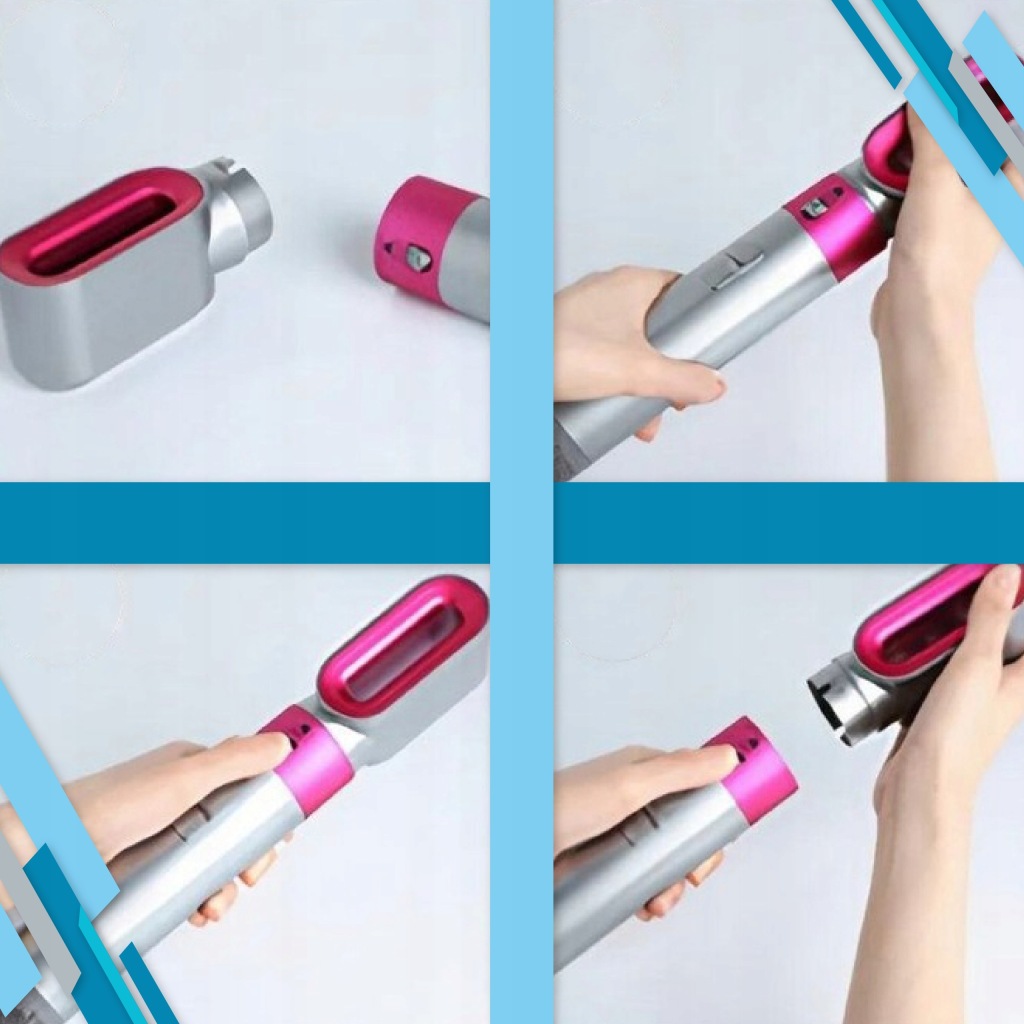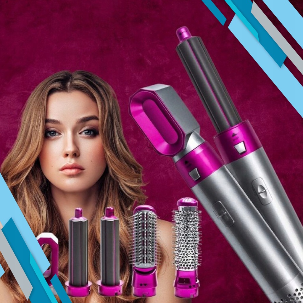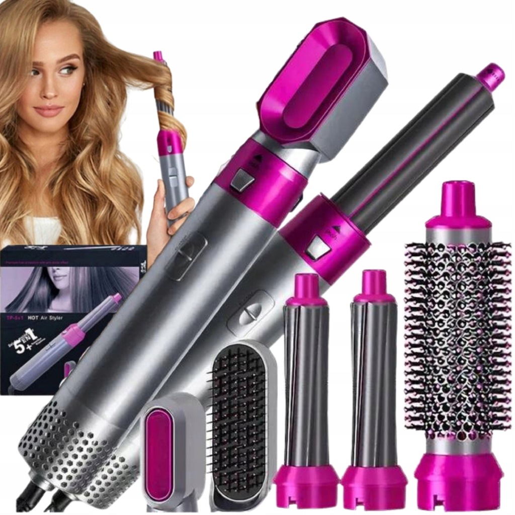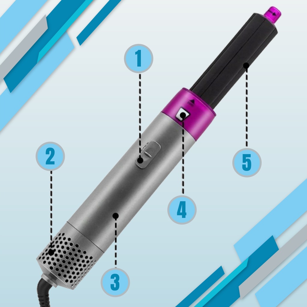 5 в 1 сушарка для волосся з гарячим повітрям для жінок оснащена пʼятьма змінними щітками, що робить випрямлення, завивку, наповнення і масаж шкіри голови легкою справою. Комбінація фенів і щіток для укладання може відповідати різній довжині волосся і створювати різні стилі. Наші інструменти для укладання гарячого повітря використовують передові технології негативних іонів і керамічне покриття для запобігання завивки і статичної електрики.