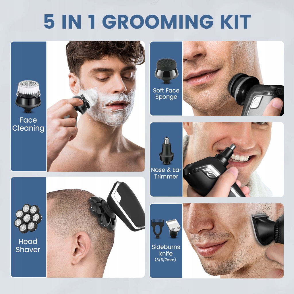 1. набір для догляду 5-в-1 : десять багатофункціональних електричних бритв оснащені пʼятьма частинами цілющих головок, включаючи текстурну головку, тример для волосся, триммер для носа, масажну щітку і щітку для чищення. З цим доступним набором для догляду у вас є все, що доступно у вигляді програмного забезпечення і вбудованого гоління.