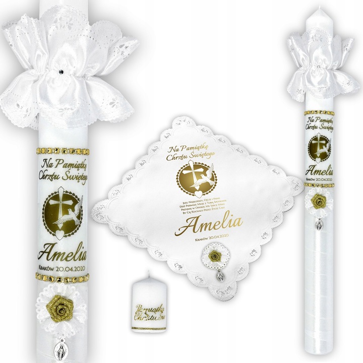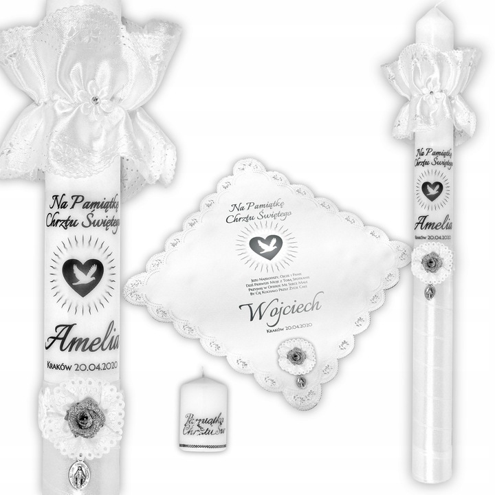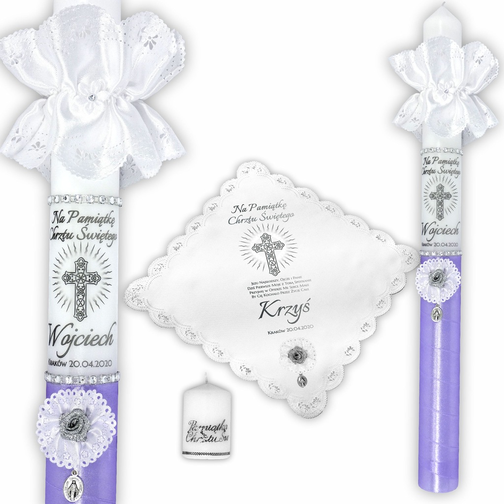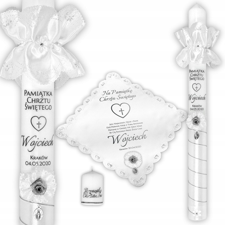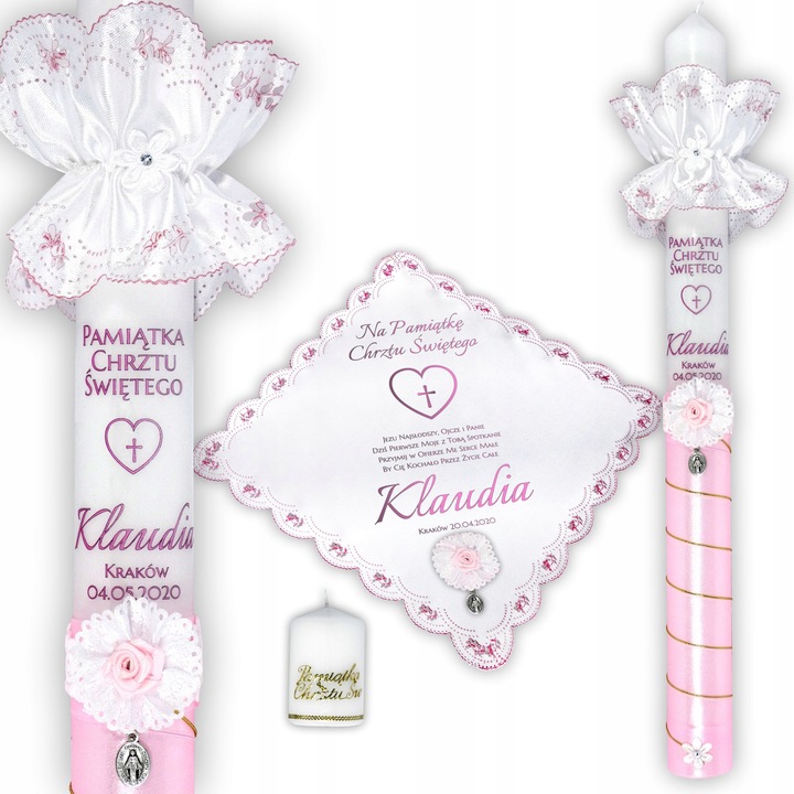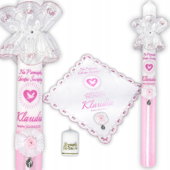 в комплекті у нас є для вас Свічка Ручної роботи разом з кольором підібраним атласним перком (поділ перка в рожевому, синьому і білому) і атласною хусткою з високоякісного матеріалу. Крім того, до кожного купленого набору в подарунок додаємо невелику свічку, яку можна поставити на стіл під час прийому після святкування Хрещення.