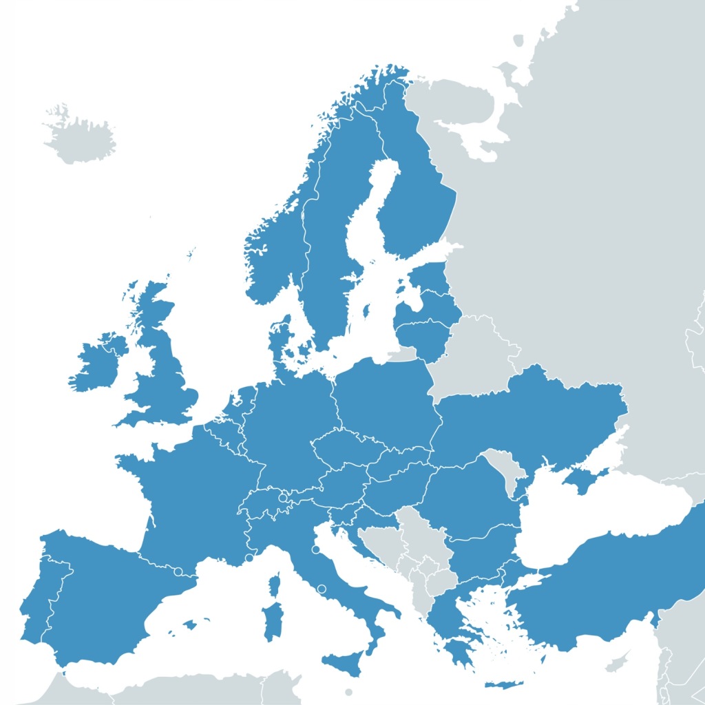 Австрія, Бельгія, Болгарія, Хорватія, Чехія, Данія, Естонія, Фінляндія, Франція, Греція, Іспанія, Нідерланди, Ірландія, Литва, Латвія, Німеччина, Норвегія, Польща, Португалія, Румунія, Словаччина, Словенія, Швейцарія, Швеція, Туреччина, Україна, Угорщина, Великобританія, Італія;