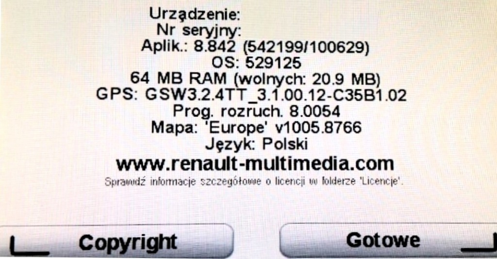 - варіант 3 (тільки якщо у вас є робоча карта): зображення з екрану Про пристрій, серійний номер і т.д. (на білому тлі), який перевіряється, натиснувши на вікно " версія..."(позначено червоною рамкою на фотографії) поруч з видом на карту після призначення маршруту