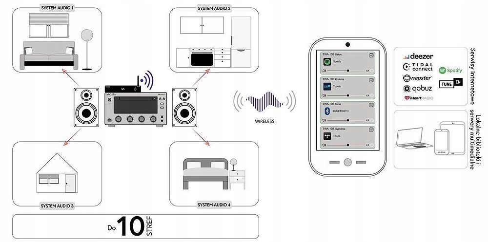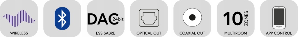 завдяки тому, що додаток використовується багатьма виробниками, ви можете змішувати продукти в різних приміщеннях або використовувати кілька однакових потокових плеєрів. Пристрій підтримує до 10 незалежних зон.
