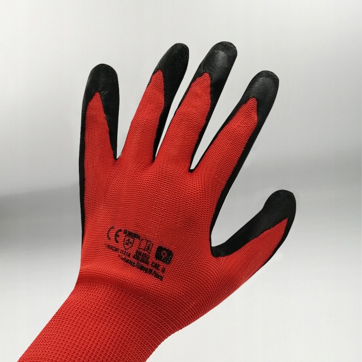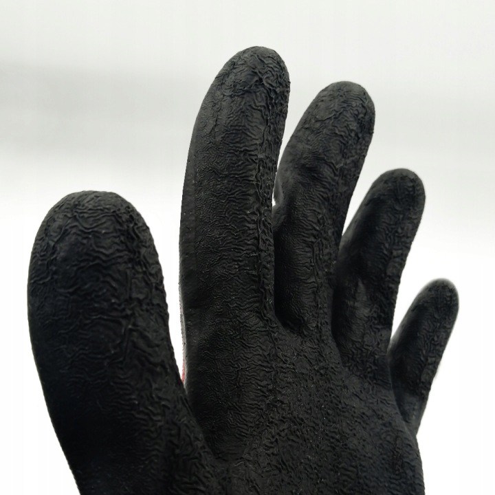 ✅ захисні рукавички з безшовного червоного поліефірного трикотажу (стібок 13). Латексне покриття з пористою структурою чорного кольору.