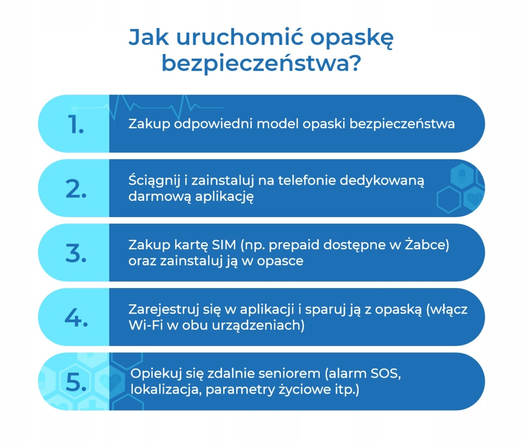 Примітка: незважаючи на те, що технологія намагається не відставати від змін, повʼязаних з поширенням віддаленого догляду, вона не замінить людину, і тому Ви повинні знати, що: Пристрої, представлені на сайті opaskadlaseniora.pl вони не є медичними приладами та / або не замінять відвідування лікаря. Життєво важливі показники, зчитувані браслетами, є орієнтовними і не можуть використовуватися для постановки діагнозу.