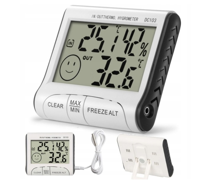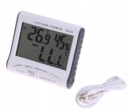 - з провідним зовнішнім датчиком, який можна розтягнути зовні будинку для визначення температури зовнішнього повітря, а також з вбудованим датчиком для одночасного вимірювання температури в приміщенні