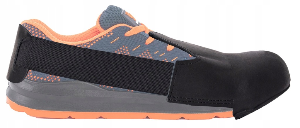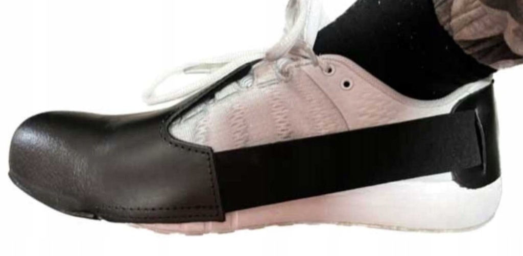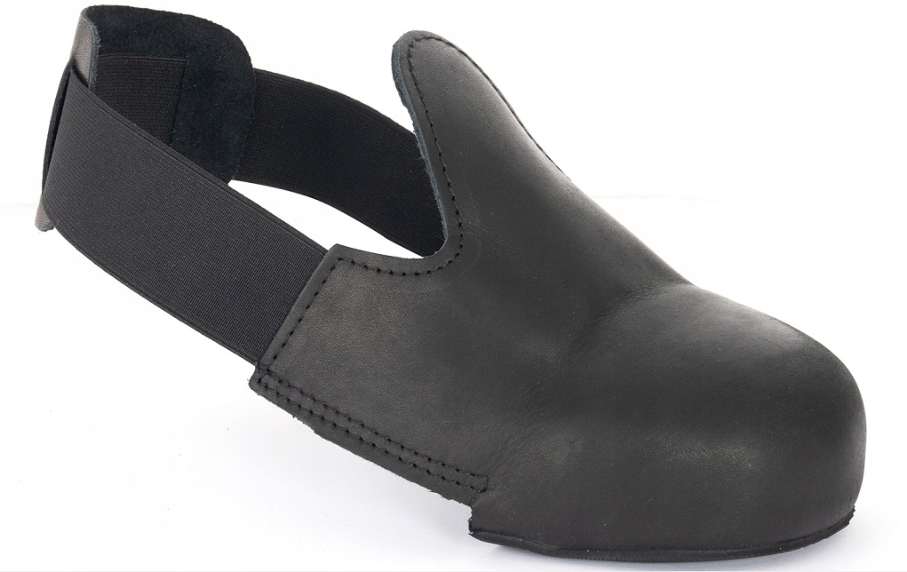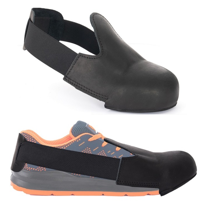 захисна накладка для взуття має металевий носок для захисту пальців ніг від ударів і стиснення , повністю виготовлена з натуральної коровʼячої шкіри, має еластичний гумовий ремінець, який легко адаптується до взуття, внутрішня частина накладки оброблена мʼякою підкладкою.