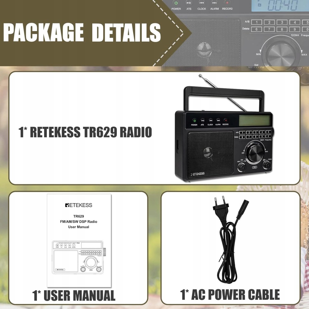 стандартне обладнання: 1 * retekess tr629 Радіо; 1 * кабель живлення; 1 * Керівництво користувача(також можна відправити електронну версію керівництва польською мовою)