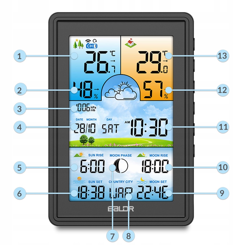 пристрій автоматично синхронізується з датчиком і має можливість підключення додаткових датчиків. У той же час він показує вимірювання зі станції і з датчика, які ви легко прочитаєте на кольоровому дисплеї.