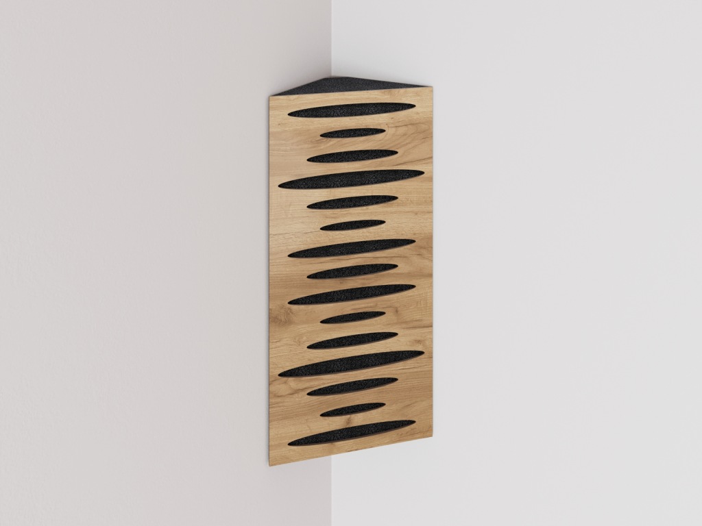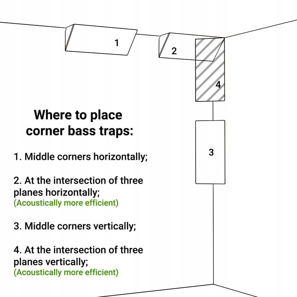 кутові акустичні панелі Narrow Trap (басові пастки) поєднують в собі функцію поглинання в діапазоні низьких частот і відображення звуку за допомогою акустичної піни і розсіює пластини. Ці пристрої відмінно працюють практично в будь-якій кімнаті, де є проблеми з низькочастотної реверберацією і стоячими хвилями. Товста акустична основа, виготовлена з акустичної піни 100 мм, забезпечує необхідну продуктивність в низькочастотному діапазоні. Ідеально підходить для розміщення в кутку під стелею, а також в кутах стін, якщо не вистачає місця для стандартної басової пастки.