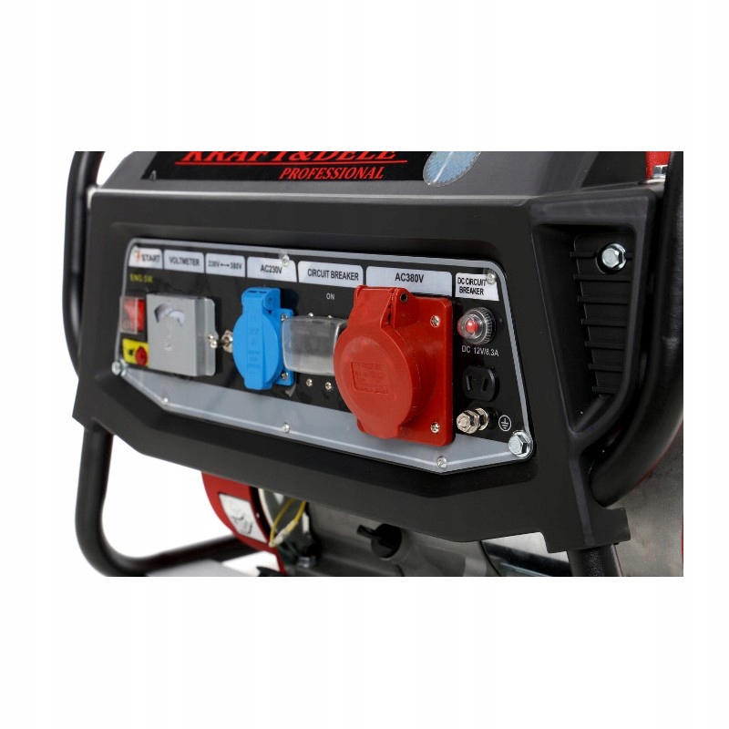 два твердих розетки 230v і 380V додатково вхід 12V для зарядки акумуляторів. Запобіжник, який захищає Генератори від перевантаження, додатково захищений гумовою кришкою, яка захищає його від різних видів бруду (води, піску і т.д.) Вхід для зарядки акумулятора також оснащений запобіжником. Ми також знайдемо масляний індикатор і великий і зручний Перемикач запалювання.