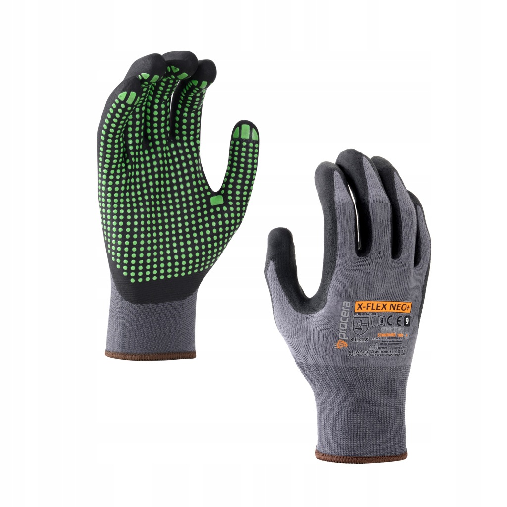 захисні рукавички X-FLEX NEO+ виготовлені з трикотажного нейлону і поліестеру з додаванням лайкри, покриті в захватной частини спіненим нітрилом чорного кольору і додатковим покриттям зеленого кольору. Ідеально підходить для ручної роботи. Підвищена стійкість до масел і мастильних матеріалів. Вони добре вписуються в форму. Відмінна посадка і гнучкість, а також відчуття предметів, забезпечуючи при цьому високу механічну міцність.
