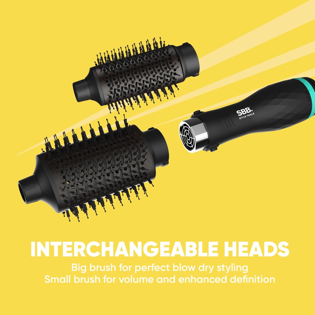 цей багатофункціональний обовʼязковий елемент для укладання волосся оснащений двома змінними щітковими головками – великий аерограф для сильної сухої обробки і аерограф середнього розміру для обсягу, точної укладання і визначення.