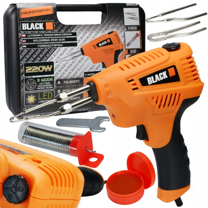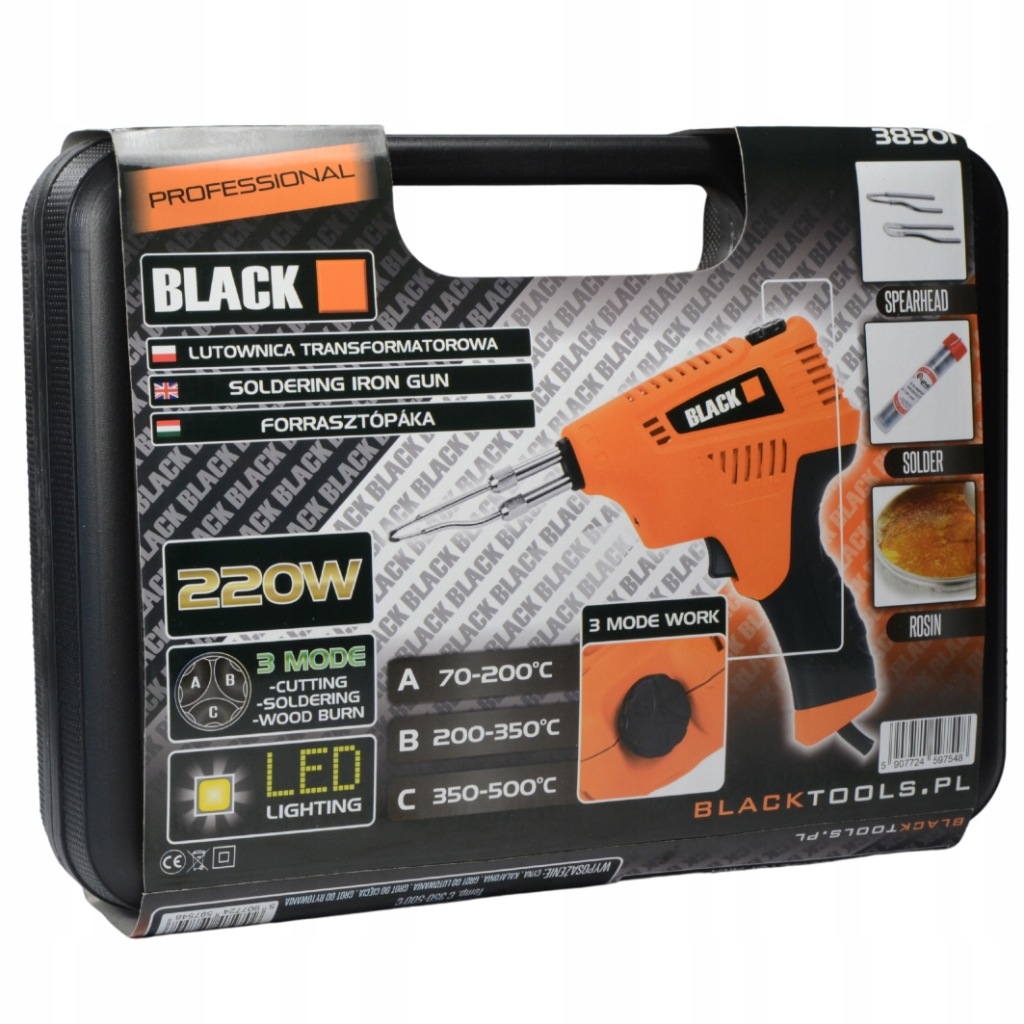 трансформаторний паяльник BLACK 38501 призначений для зʼєднання при пайку Металевих матеріалів оловʼяно – свинцевими сполучними для мʼякої пайки. Паяльник слід використовувати в періодичному циклі S2 20% - максимум12 з нагріву, після чого слід припинити роботу не менше 48 С.