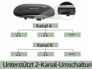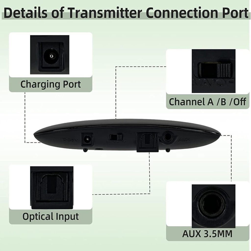 - канали з кнопковим перемиканням; передавач може бути підключений до декількох навушників в кожному каналі; сумісний з більшістю брендів телевізорів на ринку; підтримує оптоволоконний джерело звуку і вхід RCA