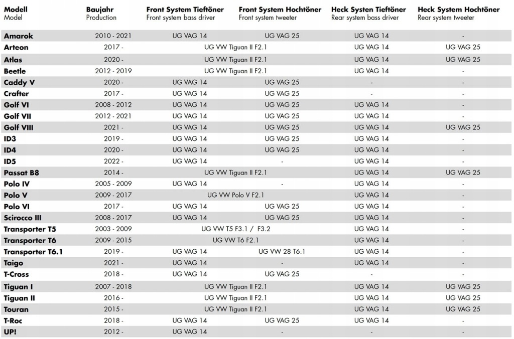 завдяки складній конструкції і координації UG VAG 14 може бути інтегрований в різні Легкові автомобілі, будинки на колесах і фургони. Він сумісний з VW Transporter T6.1, Polo V, Golf 6 ззаду, Golf 8, E-Golf, Tiguan II ззаду, T-Roc, t-Cross, Caddy і багатьма іншими. Комплект поставки: 1 пара низькочастотних драйверів (музична потужність 80 Вт, характерний звуковий тиск 88,5 дБ), 1 пара низькочастотних кросоверів. UG VAG 14 був розроблений в Німеччині.