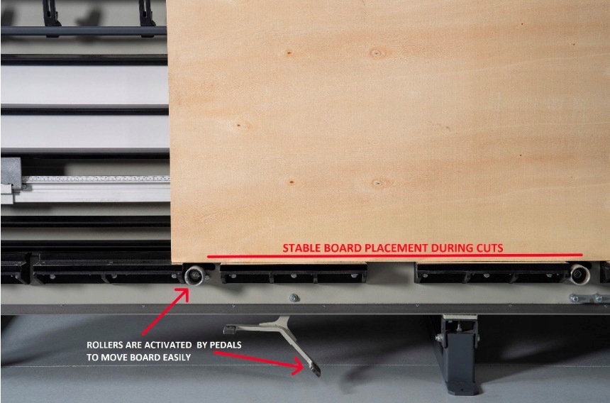 задні опори захищені від пошкоджень при роботі горизонтального розкрою завдяки автоматично ковзному задньому столу.