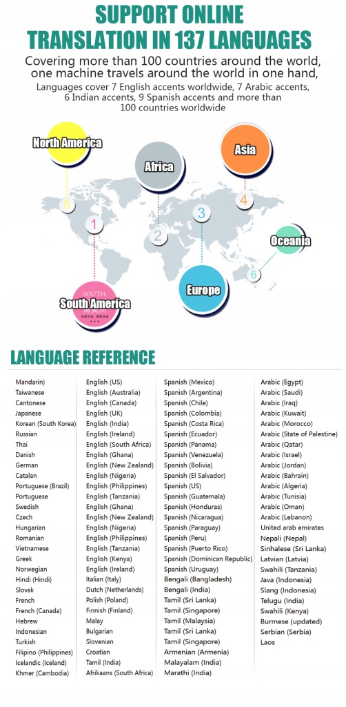 пропонує онлайн-переклад на 137 мов і переклад фотографій на 44 мови. Ви також можете здійснювати особисті перекази через Зʼєднання з Wi-Fi або точкою доступу, що є більш точним і зручним, ніж мобільні додатки. Точність онлайн-перекладу становить 95% для щоденних коротких розмов.