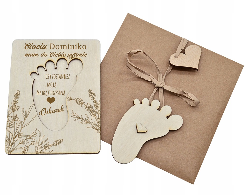 На наступному аукціоні ми представляємо Вам у вигляді деревʼяної картки запит майбутньої хрещеної матері вашої дитини. Гравер Імен на деревʼяному листі і чудове посвячення, безсумнівно, стануть сувеніром на дуже довгий час. Цей подарунок змусить посміхнутися на обличчі кожного одержувача.