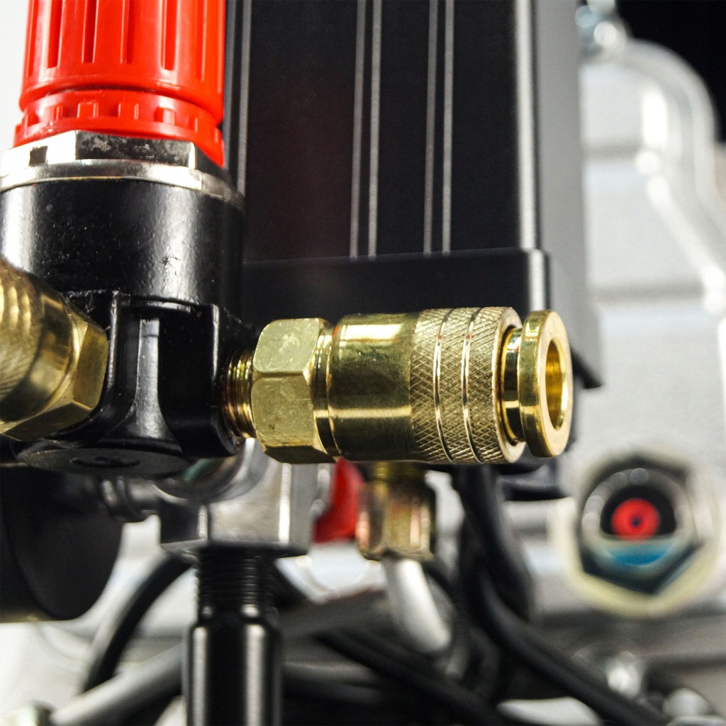 - ергономічний-має редуктор тиску, оснащений інноваційним механізмом регулювання, 2 великих манометра, розташованих на компресорі в положенні, що полегшує зчитування параметрів, і зручний в експлуатації зливний кран.