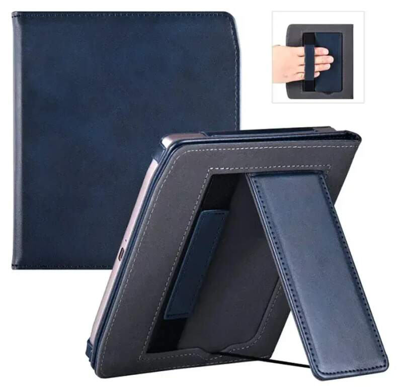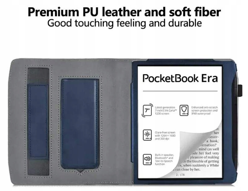 чохол виготовлений з шкіри PU (нубук) з тонкою обробкою. Чохол приємно лежить в руці, а завдяки покриттю не ковзає в руці. Поверхню можна просто протерти змоченою тканиною. Внизу пластик вирізаний в області кнопки і розʼєму. Зчитувач не потрібно виймати з чохла, його можна зручно використовувати і заряджати навіть в чохлі. Внутрішня сторона покрита замшею, яка прилягає до екрану читача в закритому стані. таким чином, немає ризику подряпати дисплей. Цей чохол ідеально підходить для подорожей і перенесення завдяки компактним розмірам і вазі.