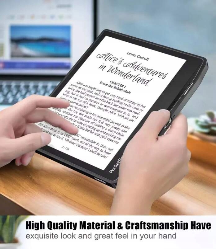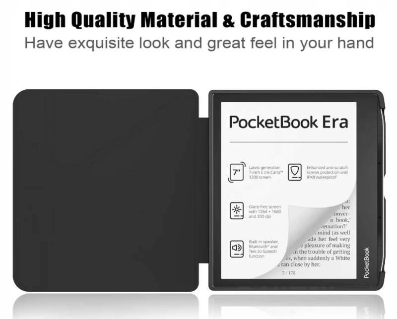 високоякісний чохол для читання Pocketbook 700 Era пропонує міцне кріплення і елегантний дизайн. Поверхня зі штучної шкіри проста в догляді і стійка до зносу. Корпус тонкий, міцний, з магнітним закриттям. Практичний дизайн забезпечує легкий доступ до всіх елементів управління без необхідності виймати зчитувач з чохла.