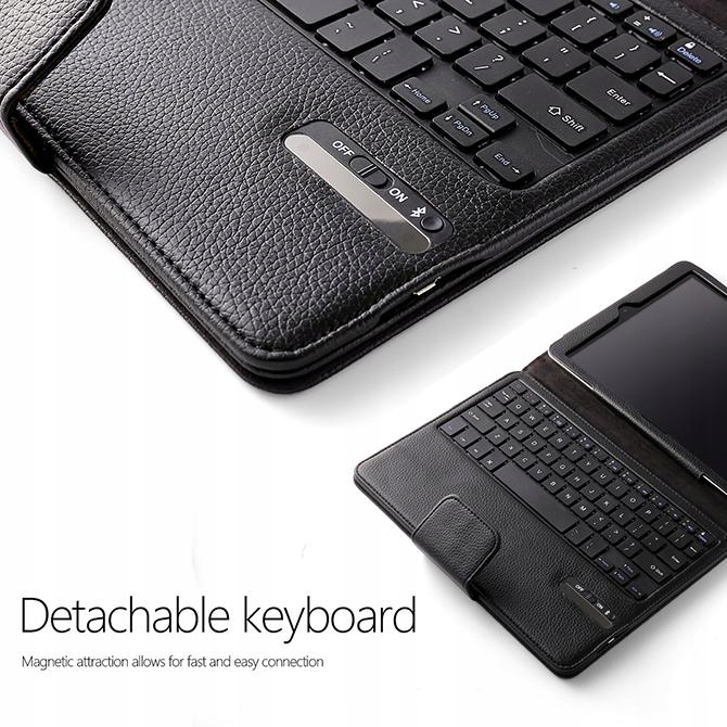 практичний чохол PROTECT для читання книг Amazon Kindle Fire 7", 2.Gen. з класичним способом кріплення. Зчитувач може бути вставлений в Шкіряний виріз, де він міцно тримається. У верхній частині знаходиться "заглушка", яка запобігає випаданню зчитувача з корпусу. Чорний чохол , який відмінно захищає ваш читач. Закриттямагнітне . Поверхня корпусу не з гладкої шкіри, але має тонку обробку (так звана Кінська шкіра). Упаковка пропонує практичну підставку завдяки вигину передніх пластин. Чохол включає в себебездротову клавіатуру , яка підключається черезbluetooth . Розкладний чохол з планшетом імітує класичний ноутбук.
