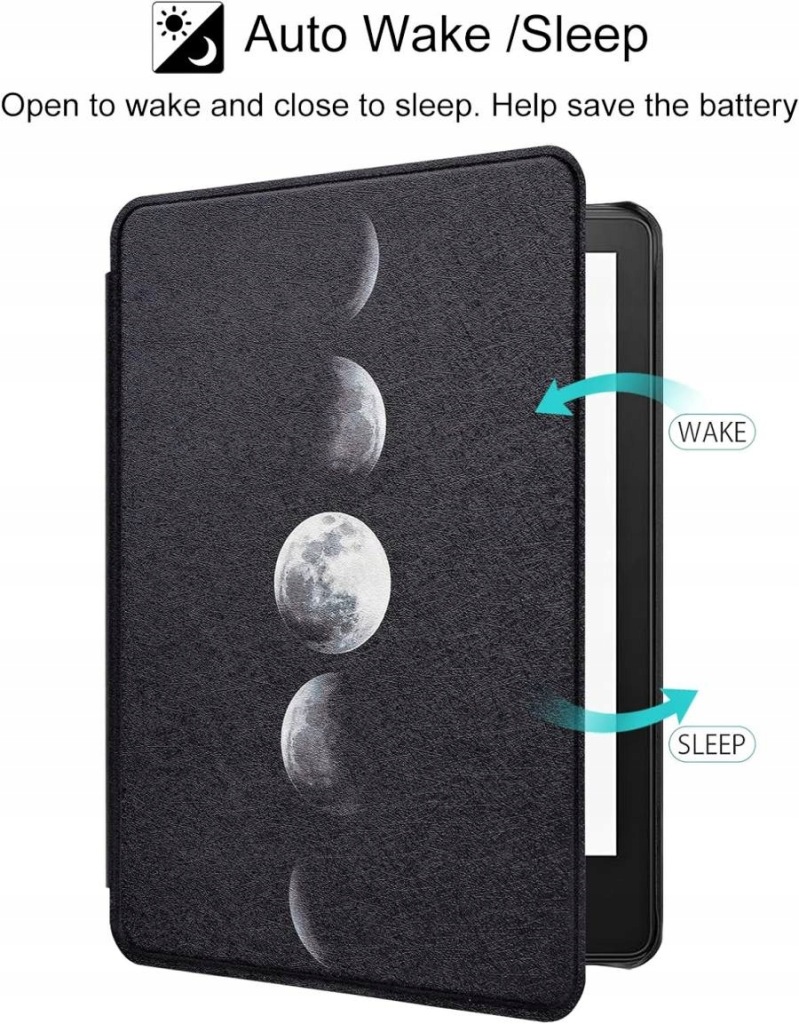 чохол маємагнітне закриття . Габаритні розміри і вага дуже компактні і майже точно копіюють розміри читача. Звичайно, чохол пропонує функцію автоматичного засинання / пробудження читача в залежності від того, як ви відкриваєте або закриваєте чохол. Передні пластини можуть повертатися на 360°, що дозволяє зручно тримати корпус в одній руці. Чохол барвистий, з повним друком, тема Moon Eclipse, з тонкою обробкою. Доступний широкий вибір інших колірних варіантів.