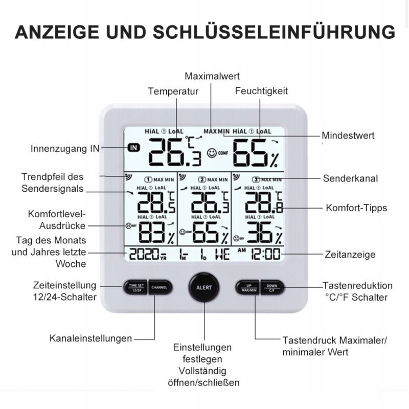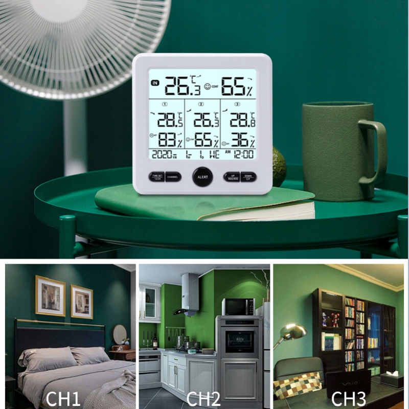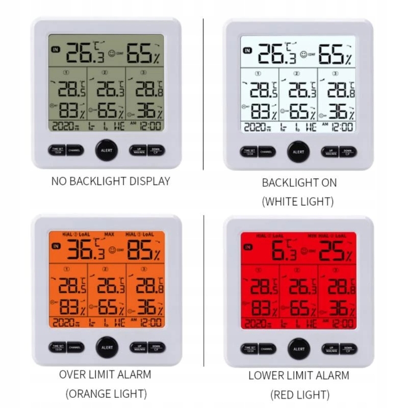 - РК-дисплей, легко читається, точний і надійний. Він може відображати 3 канали, а також вологість і температуру в приміщенні на 3 різних рівнях.