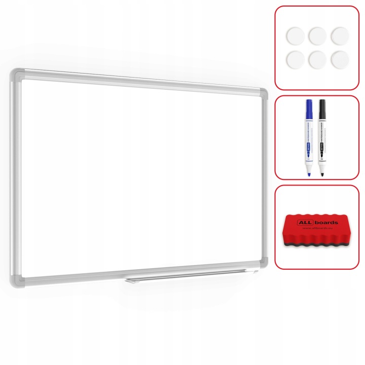 Біла магнітна дошка allboards виготовлена з жорсткого і міцного листового металу, завдяки якому дошка набуває магнітні властивості . Лист покритий шаром лаку, який надає дошці білий колір і гладку і блискучу поверхню. При використанні відповідного лаку дошки можна прати сухими за допомогою додається губки або паперового рушника.