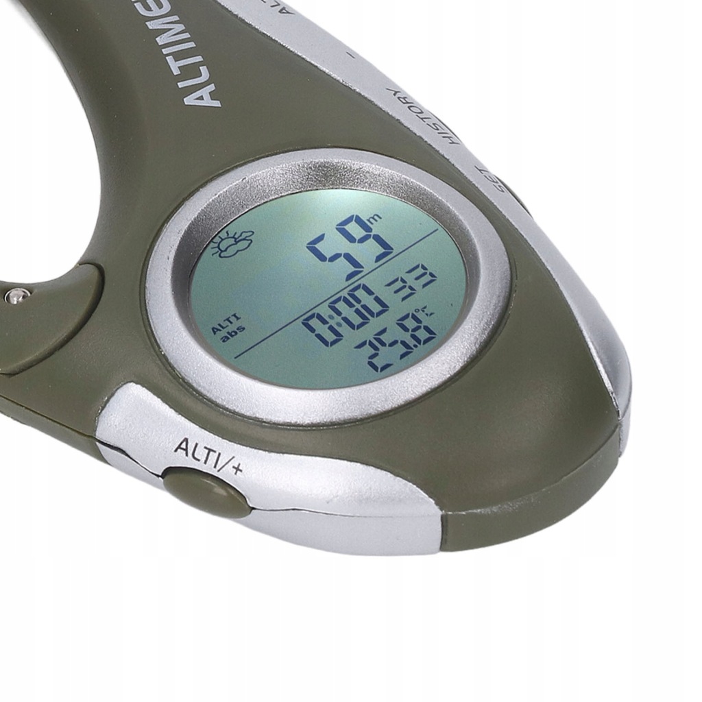 1. [Багатофункціональний інструмент] цифровий висотомір заснований на азимутальній електроніці та барометричному датчику та відображає підшипник, напрямок, годинник, температуру, прогноз погоди та висоту.