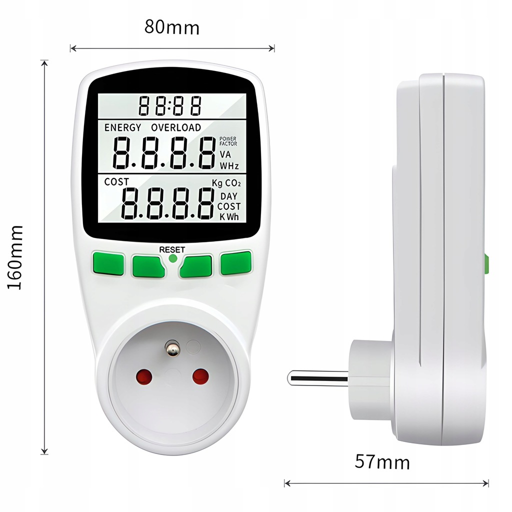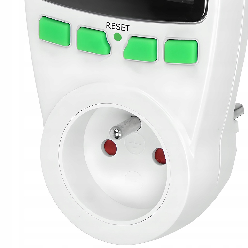 лічильник енергоспоживання з дисплеєм і сигналізацією перевантаження . Перед першим використанням ватметра необхідно скинути його. Для цього утримуйте протягом 10 секунд зелену кнопку RESET, розташовану на корпусі трохи нижче дисплея.