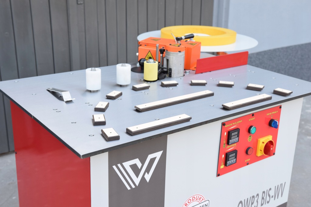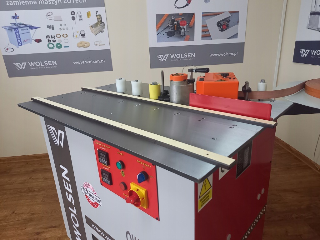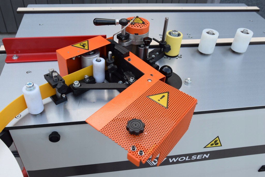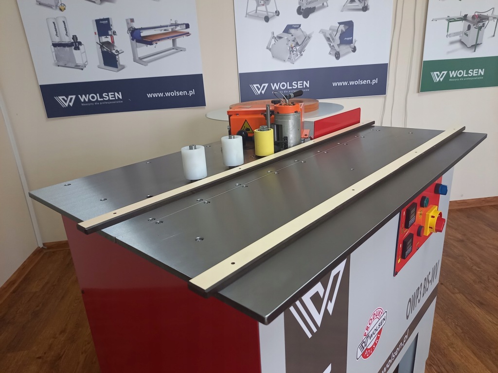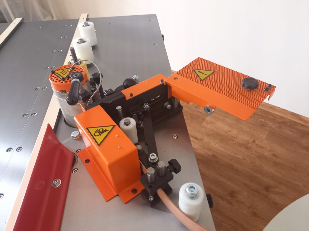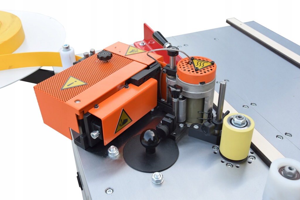 облицювальний верстат з клейовим баком для нанесення клейового шару на кромку під час виконання функції облицювання. Машина не вимагає стисненого повітря-оператор керує функціями машини за допомогою ножної педалі, підтримуваної газовою пружиною. Польський продукт