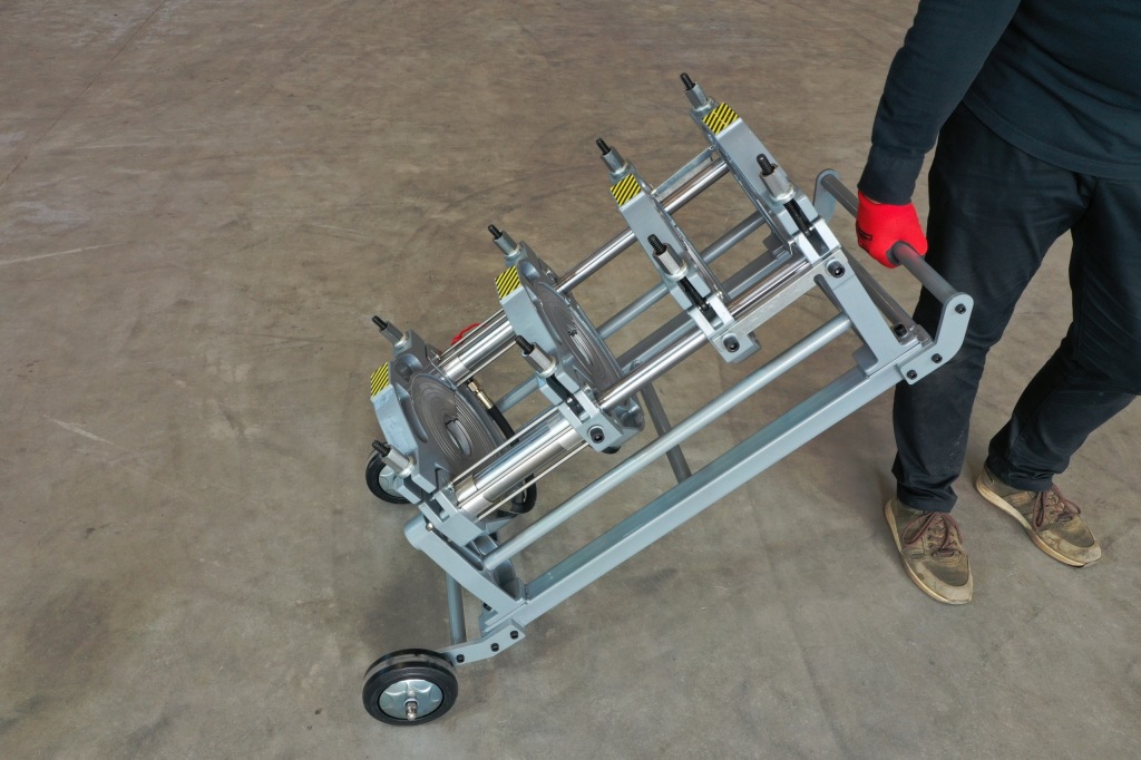 - сани з можливістю установки транспортних коліс, оснащені двома гідравлічними циліндрами, 2 фіксованими затискачами, 2 регульованими в залежності від уподобань установки щодо труби