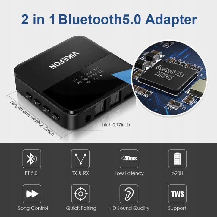 адаптер BT-B20 є найбільш технічно досконалим пристроєм VIKEFON і призначений для найвимогливіших споживачів. Адаптер призначений для прийому і передачі музики, що передається через звʼязок Bluetooth з таких пристроїв ,яксмартфон абопланшет , З і на приймачі типуресивер, акустична система або автомобільний аудіоплеєр . Адаптер VIKEFON підтримує комунікаційні протоколи Qualcomm ® aptX™, aptX™ LL і новітній протокол aptX™ HD.
