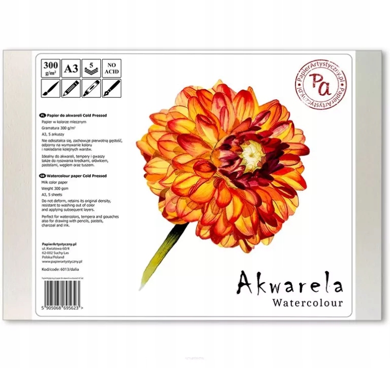 акварельний папір Cold Pressed Dalia - це 5 аркушів високоякісного паперу 300 г / м2 молочного кольору,формату A3. Він призначений для будь-якого типу водних фарб, тобто акварелі, темпери і гуаші.