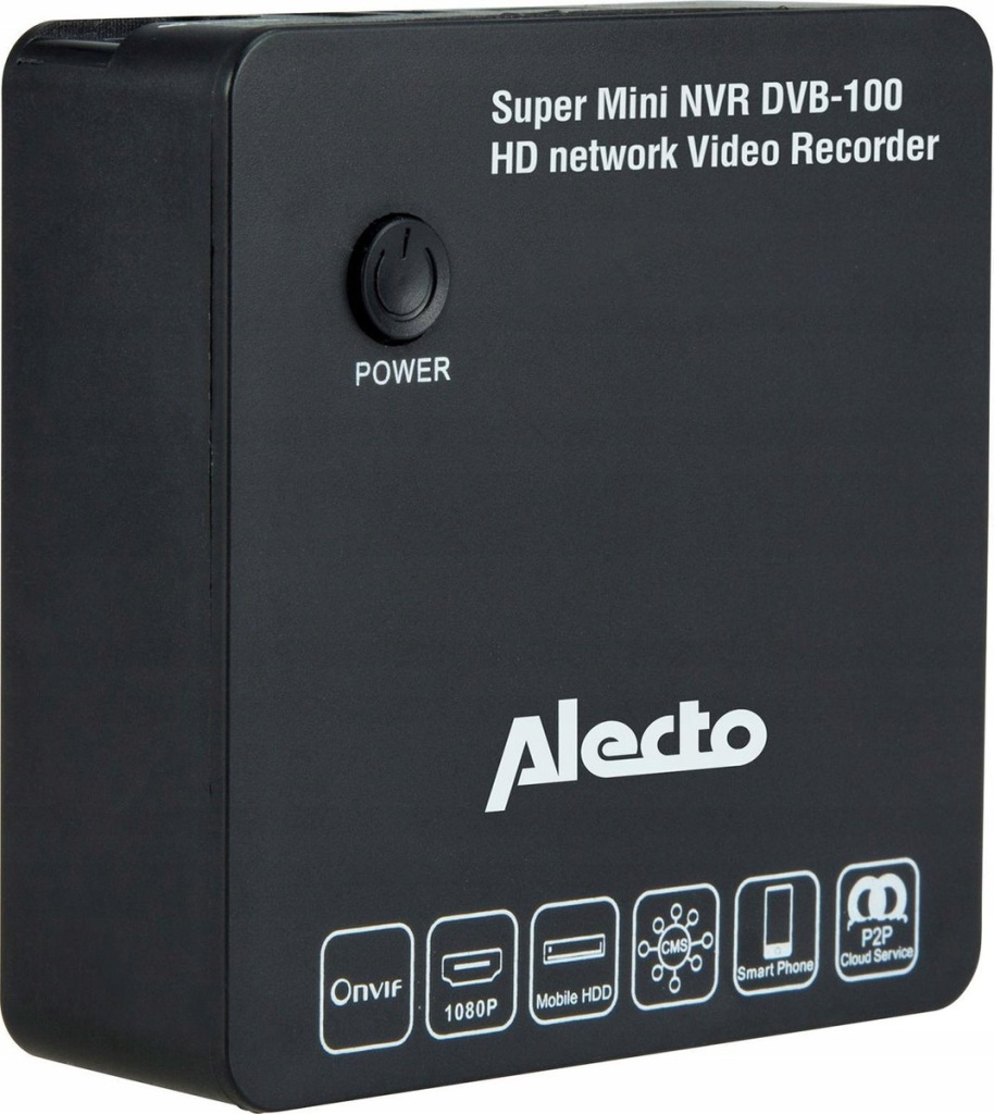- Alecto DVB-100 Super Mini Netwerk Video Recorder (NVR) дозволяє створити власну систему запису IP для захисту. Ви можете легко захистити свою квартиру або робоче місце, використовуючи до чотирьох камер. DVB-100 легко підключається до мережі за допомогою кабелю (або бездротового звʼязку) до маршрутизатора і, що ще важливіше, сумісний з усіма камерами Wi-Fi Alecto.