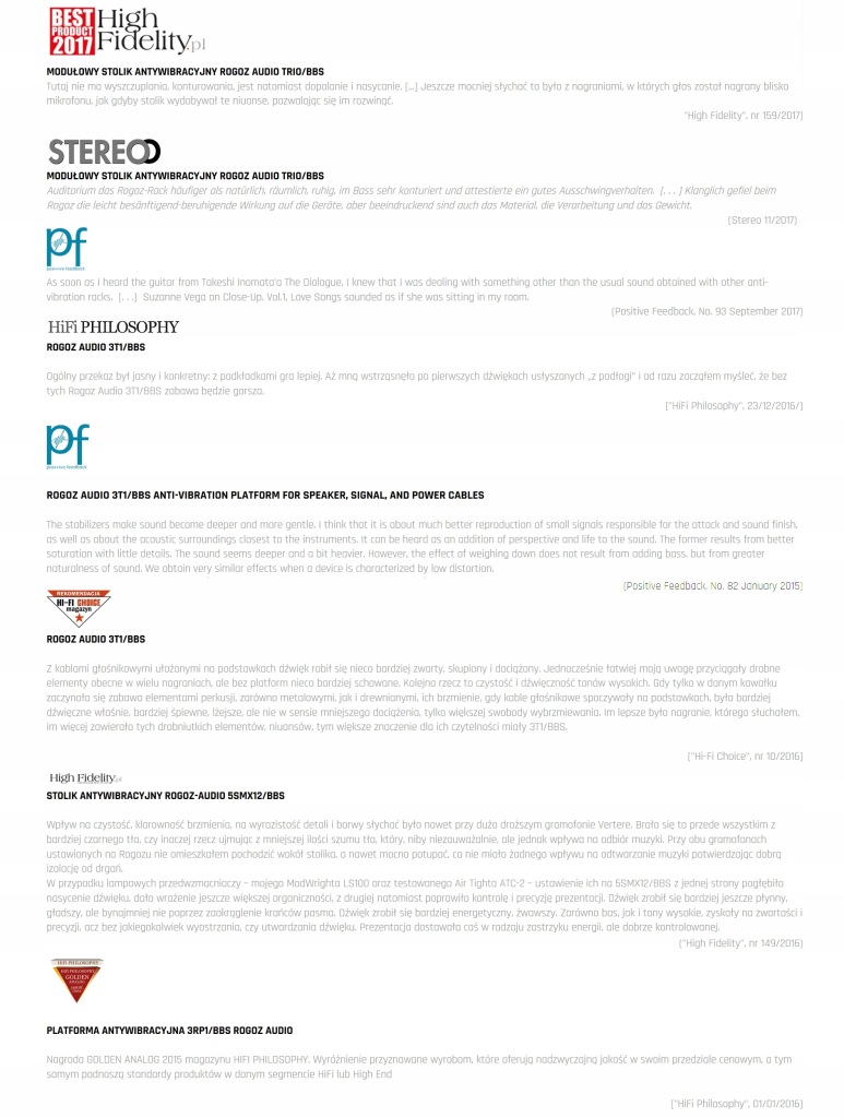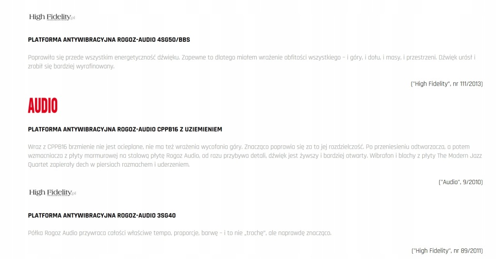 Rogoz Audio рекомендує спеціальні антивібраційні звукові Меблі: Столи, стійки, платформи та інші аксесуари. Пропозиція ми направляємо в першу чергу всім до аудіофіли і меломани, професіоналів індустрії музики і всіх цінують високу якість відтворення звуку і елегантний дизайн.