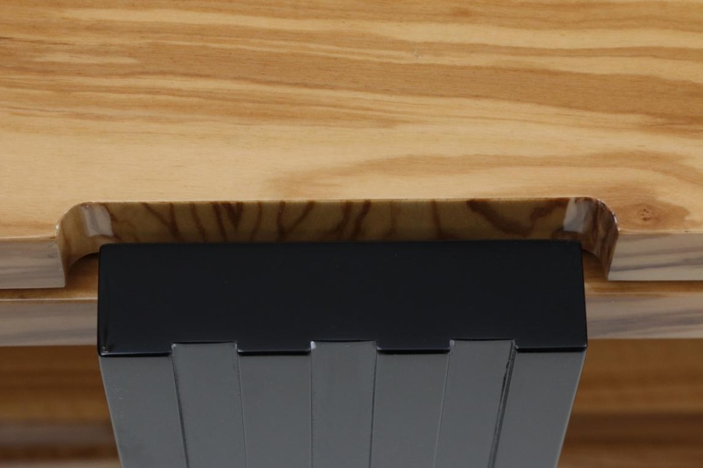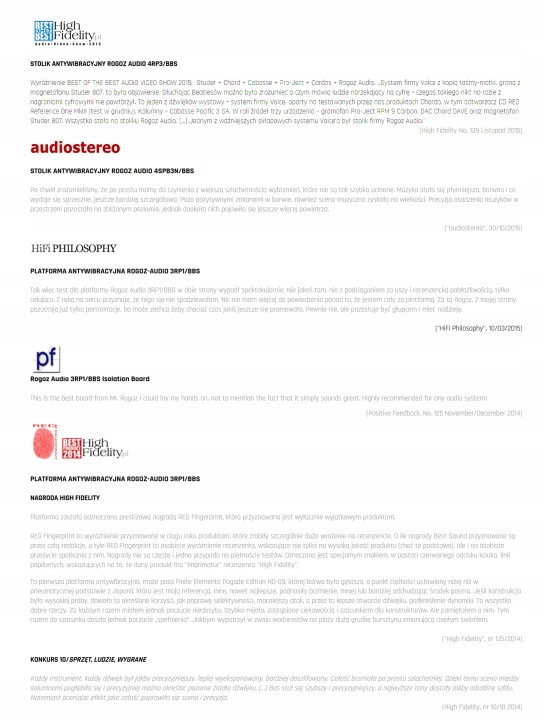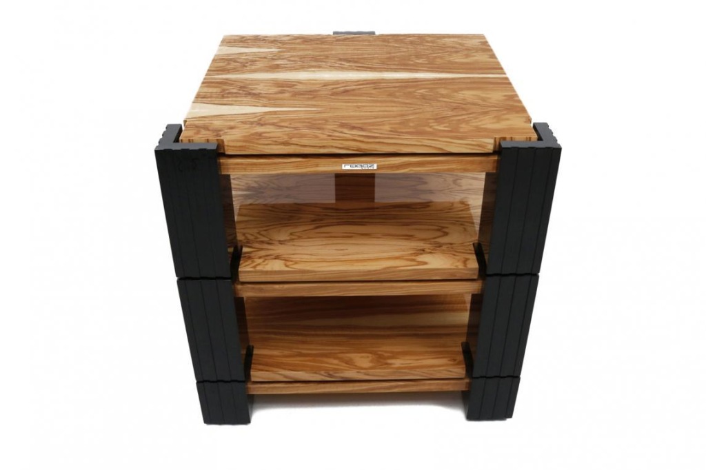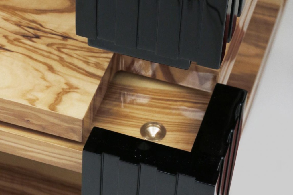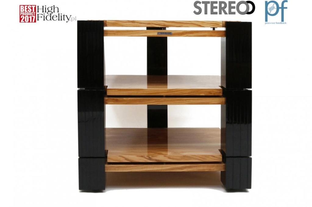 модульний, триногий, трирівневий столик з стільницями багатошарової структури, покритими деревʼяним шпоном (в представленому варіанті це дерево з оливкового дерева, високий глянець) і суцільними ніжками багатошарової структури (в представленому варіанті лаковані в чорний глянсовий рояль). Подвійні стільниці відокремлені один від одного системою BBS - системою, що поєднує в собі переваги точкової опори на шипі (мінімальна площа контакту призводить до того, що кінетична енергія вертикальних коливань втрачається шляхом перетворення в тепло) з ефективним придушенням поперечних і діагональних коливань за рахунок дії трьох типів руху одночасно: кочення, кочення і ковзання.