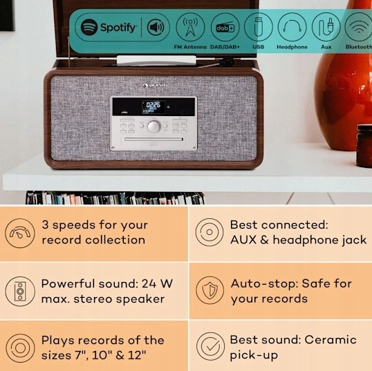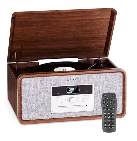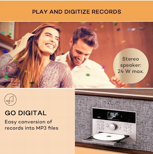 з програвачем Bella Ann Ви отримуєте весь спектр можливостей відтворення музики: будь то компакт - диски, вінілові платівки або MP3-файли через USB-компактна фірмова вежа auna готова для всіх форматів. Але це ще не все: функція Bluetooth дозволяє бездротово передавати музику зі смартфона, планшета чи компʼютера. Вбудоване цифрове радіо з прийомом DAB + / FM завершує все. Вбудований програвач дозволяє керамічній голці відтворювати вінілові платівки зі швидкістю 33 ом, 45 або 78 об / хв./хв. крім того, Bella Ann може кешувати 99 пісень MP3 і 20 пісень на компакт-дисках, щоб ваші улюблені пісні завжди були в межах досяжності. Завдяки практичній функції запису через USB ви можете записувати музику з дисків, компакт-дисків або радіо, і її дуже легко оцифрувати. Включений пульт дистанційного керування дає вам повний контроль над усіма функціями з Вашого зручного дивана.стереосистема з програвачем Bella Ann від бренду auna впишеться у вашу вітальню завдяки простому стилю і надихне функціональністю.
