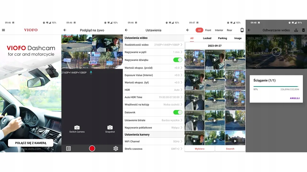 відеореєстратор VIOFO A229 PRO оснащений високошвидкісним дводіапазонним модулем WiFi, який дозволяє створити мережу, до якої ми потім можемо підключитися за допомогою телефону, з встановленим додатком VIOFO. Це дозволяє отримати доступ до перегляду з кожної камери в реальному часі, конфігурації пристрою і збереженим на карті памʼяті відеофайлів.
