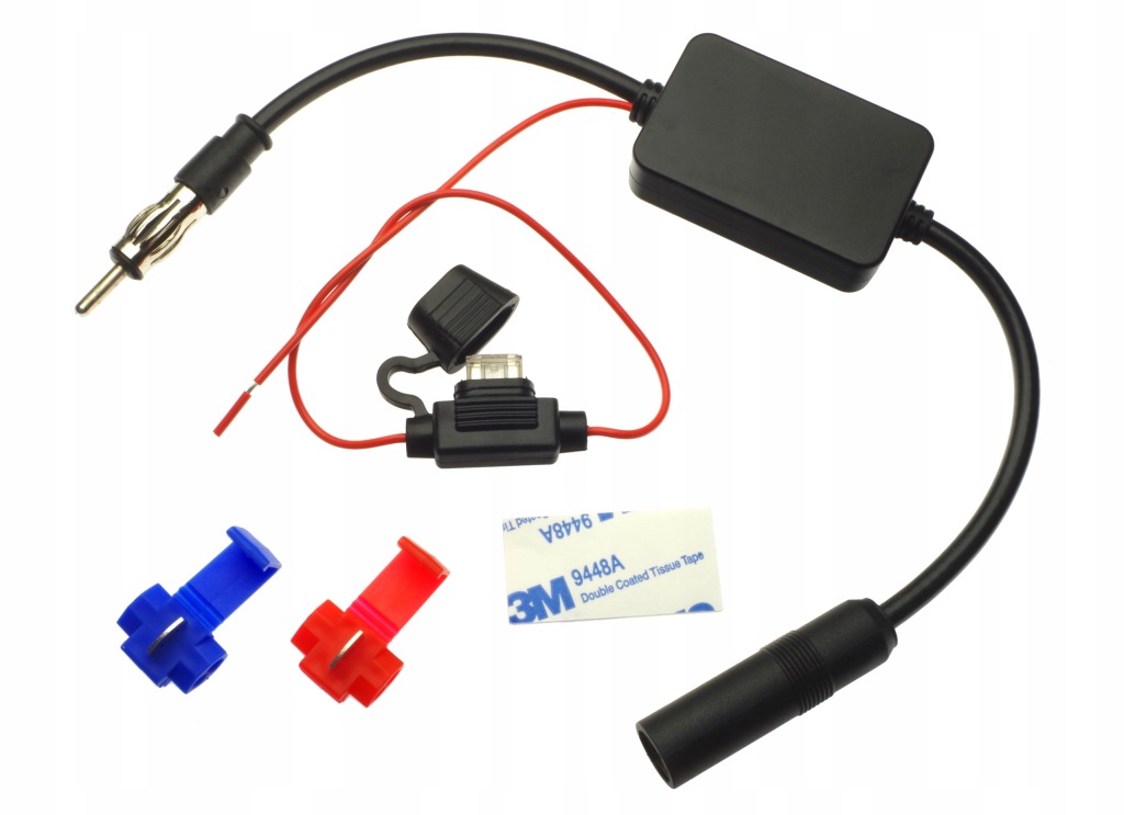 покращує якість прийому на всіх частотах діапазону FM і AM. підходить для будь-якого транспортного засобу і автомобільного радіоприймача, оснащеного антенним штекером і розʼємом din. Він відрізняється високим коефіцієнтом посилення сигналу 22 дБ + / - 3 дБ і дуже простою установкою . Червоний провід від джерела живлення підсилювача повинен бути підключений до +12v / 24v, наприклад, до виходу живлення автоматичної антени на радіо або до проводу, на якому зʼявляється струм при повороті запалювання.