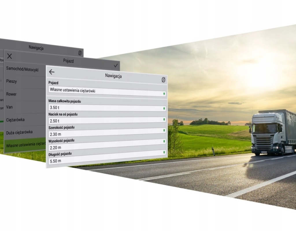 програмне забезпечення Navitel Navigator пропонує розширений набір налаштувань, необхідних для навігації по вантажоперевезенням. Виберіть тип вантажного транспорту в Налаштуваннях або створіть свій власний автомобіль, додавши його параметри: довжина, ширина, висота, максимально допустима і фактична вага, тиск осі і т.д. програма побудує маршрут відповідно до обмежень для цього типу вантажівок, що дозволить вам плавно дістатися до призначеного пункту призначення.